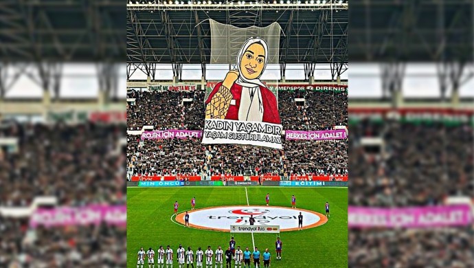 “Kadın yaşamdır yaşam susturulamaz” yazısı ile paylaşılan fotoğraf açılırken, taraftar “Jin jiyan azadî” sloganı atıldı.