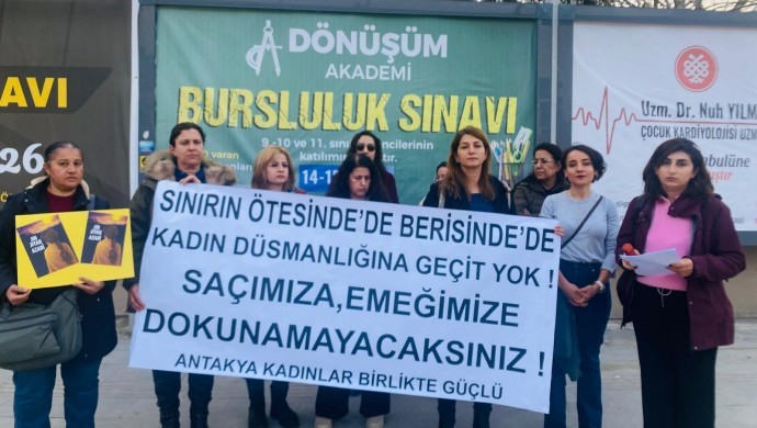 Antakya Kadınlar Birlikçe Güçlü, “Sınırın ötesinde de berisinde de kadın düşmanlığına geçit yok! Saçımıza, emeğimize dokunamayacaksınız! Hayır, Lazkiye’de makyaj yasağına Rakka’da saç kesilmesine karşı ses çıkartıyoruz” pankartıyla Necmi Asfuroğlu Anadolu Lisesi önünde açıklama yaptı.