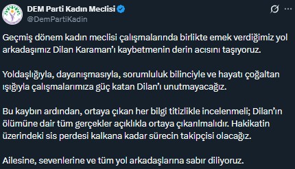 “Geçmiş dönem kadın meclisi çalışmalarında birlikte emek verdiğimiz yol arkadaşımız Dilan Karaman’ı kaybetmenin derin acısını taşıyoruz. Yoldaşlığıyla, dayanışmasıyla, sorumluluk bilinciyle ve hayatı çoğaltan ışığıyla çalışmalarımıza güç katan Dilan’ı unutmayacağız. Bu kaybın ardından, ortaya çıkan her bilgi titizlikle incelenmeli; Dilan’ın ölümüne dair tüm gerçekler açıklıkla ortaya çıkarılmalıdır. Hakikatin üzerindeki sis perdesi kalkana kadar sürecin takipçisi olacağız. Ailesine, sevenlerine ve tüm yol arkadaşlarına sabır diliyoruz.”