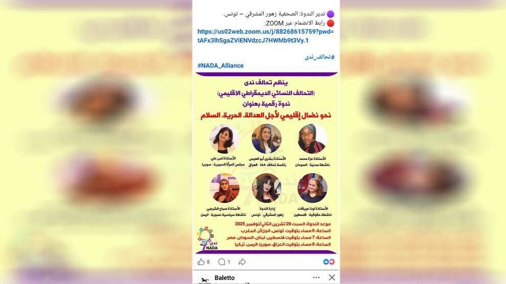“Adalet, özgürlük ve barış için bölgesel bir mücadeleye doğru” sloganıyla Ortadoğu ve Kuzey Afrika Bölgesel Demokratik Kadın Koalisyonu (NADA) tarafından 29 Kasım’da Zoom üzerinden bir panel düzenlendi. Panelde Ortadoğu ve Kuzey Afrika’daki kadınların durumu ele alınırken, kadınların sesini kısmayı hedefleyen şiddete karşı adalet için feminist mücadelenin, direnişin ve dayanışmanın önemi tartışıldı.