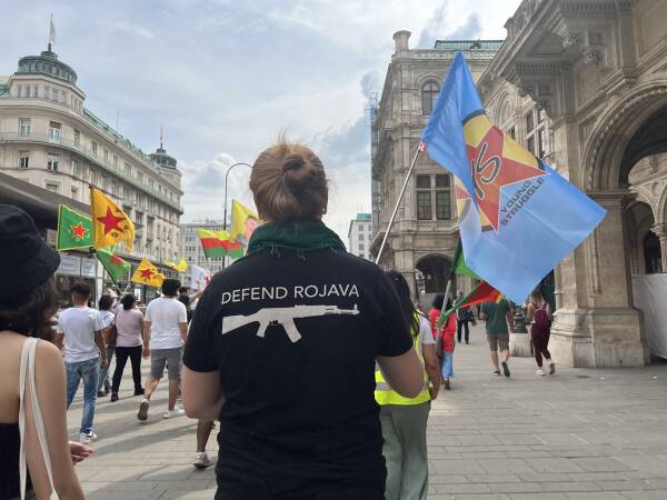Stephansplatz’da Oper‘e kadar düzenlenen yürüyüşte PKK’nin ‘terör örgütleri listesi’nden çıkarılması için imza da toplandı.